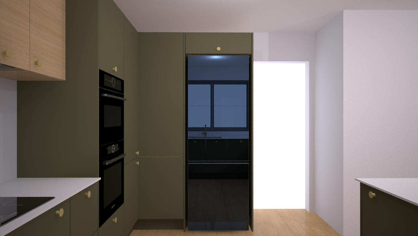 - The integrated 70cm fridge freezer has been retained. The space around the appliance has been reduced as access to the side pull handle is enabled by the door being proud of the cabinetry by about 20mm.