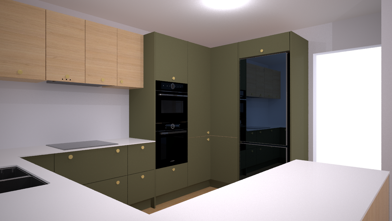 - The integrated 70cm fridge freezer has been retained. The space around the appliance has been reduced as access to the side pull handle is enabled by the door being proud of the cabinetry by about 20mm.